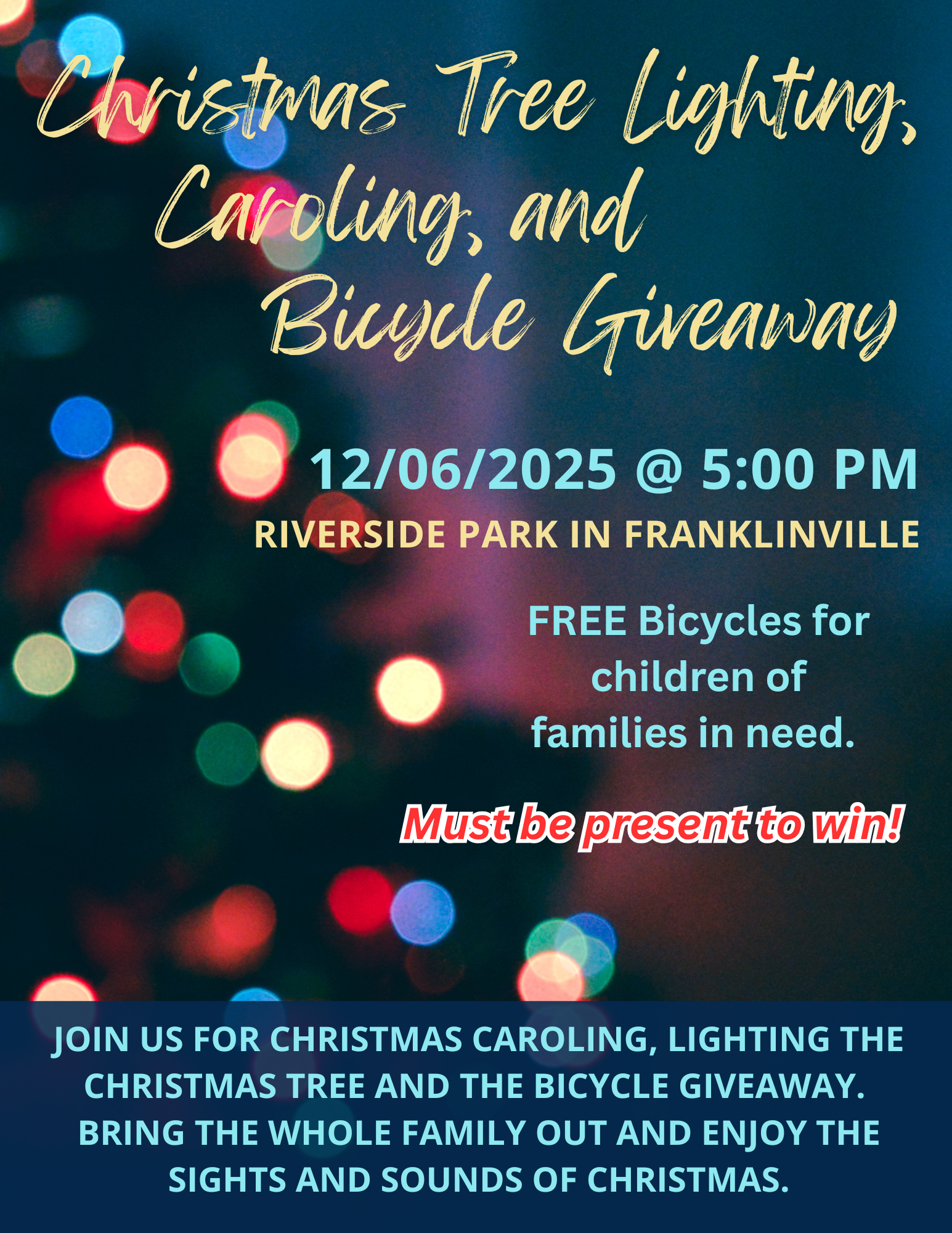 Join us as we celebrate the Christmas season! Tree lighting and caroling in the park, Saturday, December 6th at 5:00 pm. FREE bicycle giveaway (must be present to win).